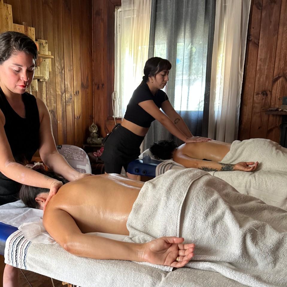 Dos personas en la misma sala. El masaje puede ser de relajación, descontracturante o mixto. Agrega utilización de piedras calientes o ventosas por $3.000